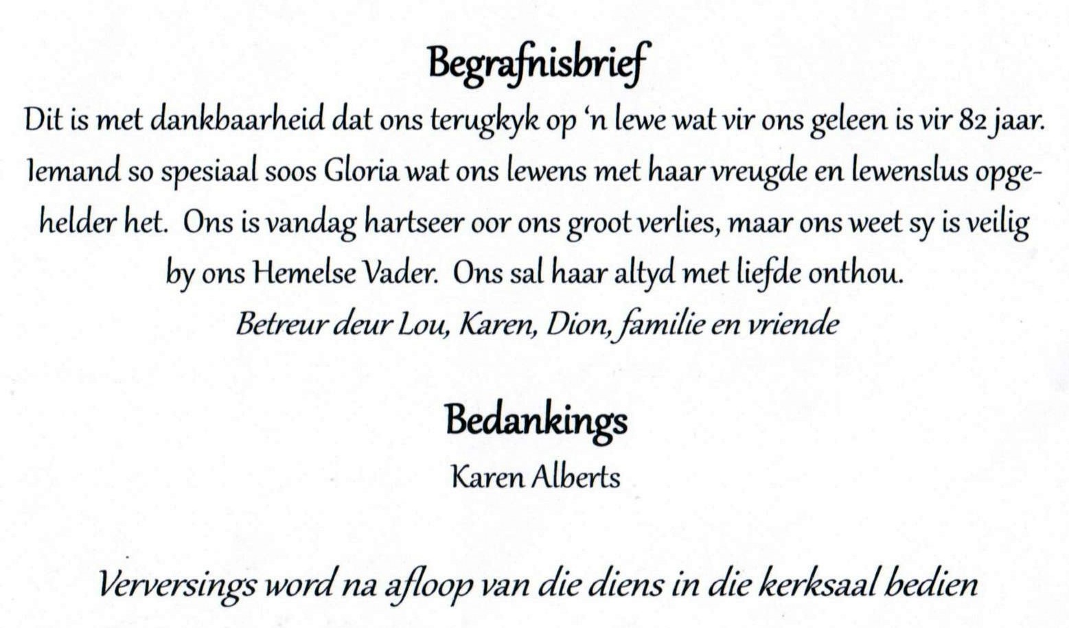 Volgens E-mail ontvang vanaf Lourens De Jager gedateer 20260118 die volgende addisionele info: Goeie dag Hendrik Ek heg die begrafnisbrief van Gloria Alberts aan - sy was getroud met Lourens Marthinus (Laurie) ALBERTS (Gebore 19 Sept 1940), hy was die jongste seun van Lourens Marthinus(Lourens) ALBERTS (20 Nov 1902-15 Mrt 1969) en Hendrina Johanna(Ousus) Geb. PRETORIUS (29 Des 1903- 9 Aug 1996). Ek het egter nog nie haar voorouers nagevors nie. Die egpaar het 2 kinders ('n seun en 'n dogter) gehad, en was woonagtig te Groenkloof, Pretoria. Haar man Laurie leef nog. Vriendelike Groete, Christiaan Lourens(Lourens) de Jager