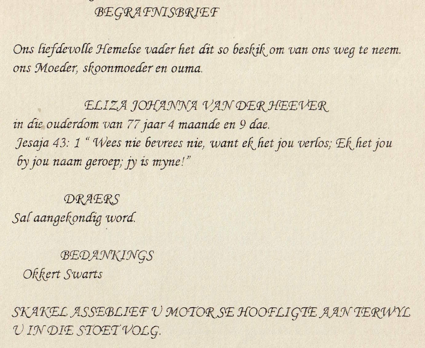 Funeral Programs / Begrafnisbriewe