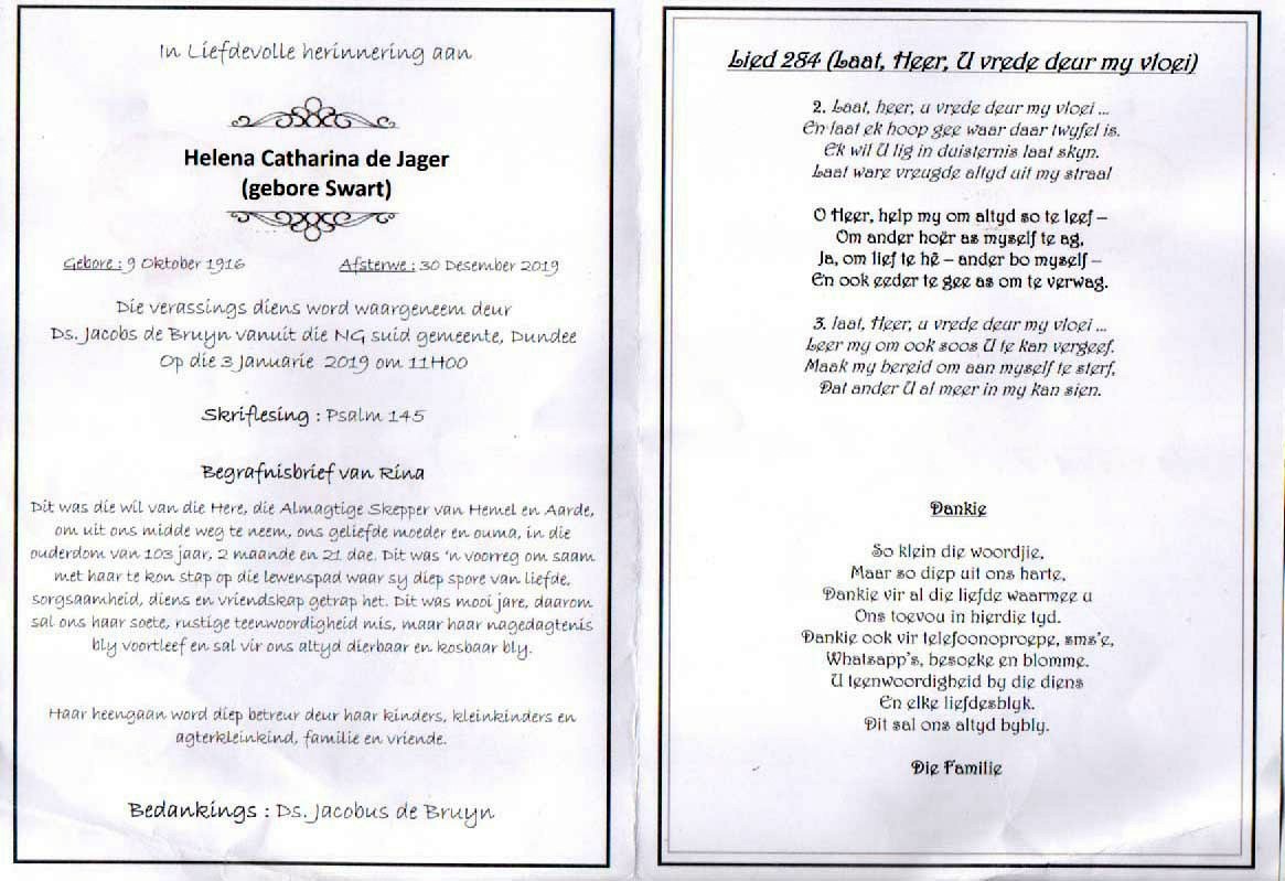 JAGER-DE-Helena Catharina-Nn-Rina-nee-Swart-1916-2019-F