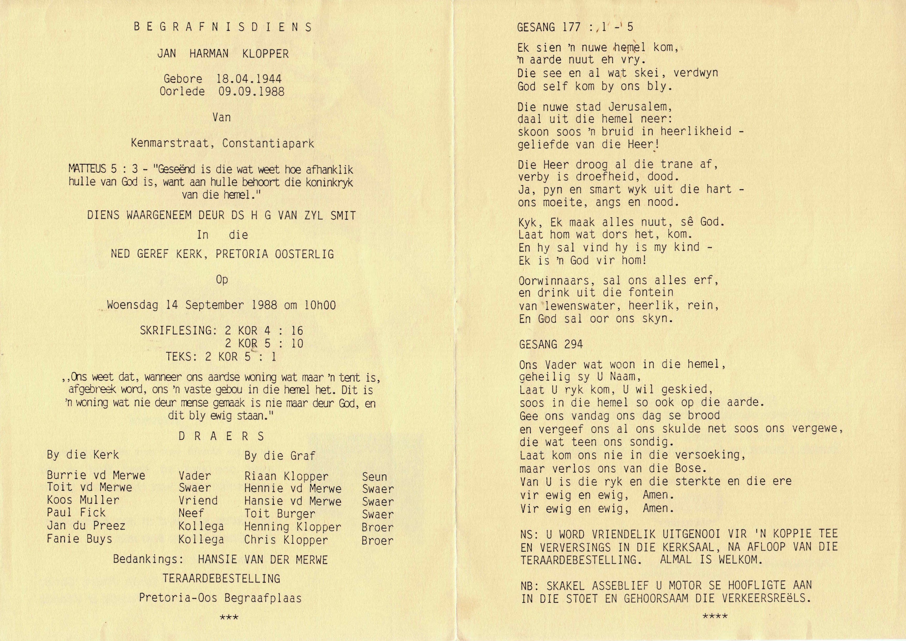 Funeral Programs / Begrafnisbriewe