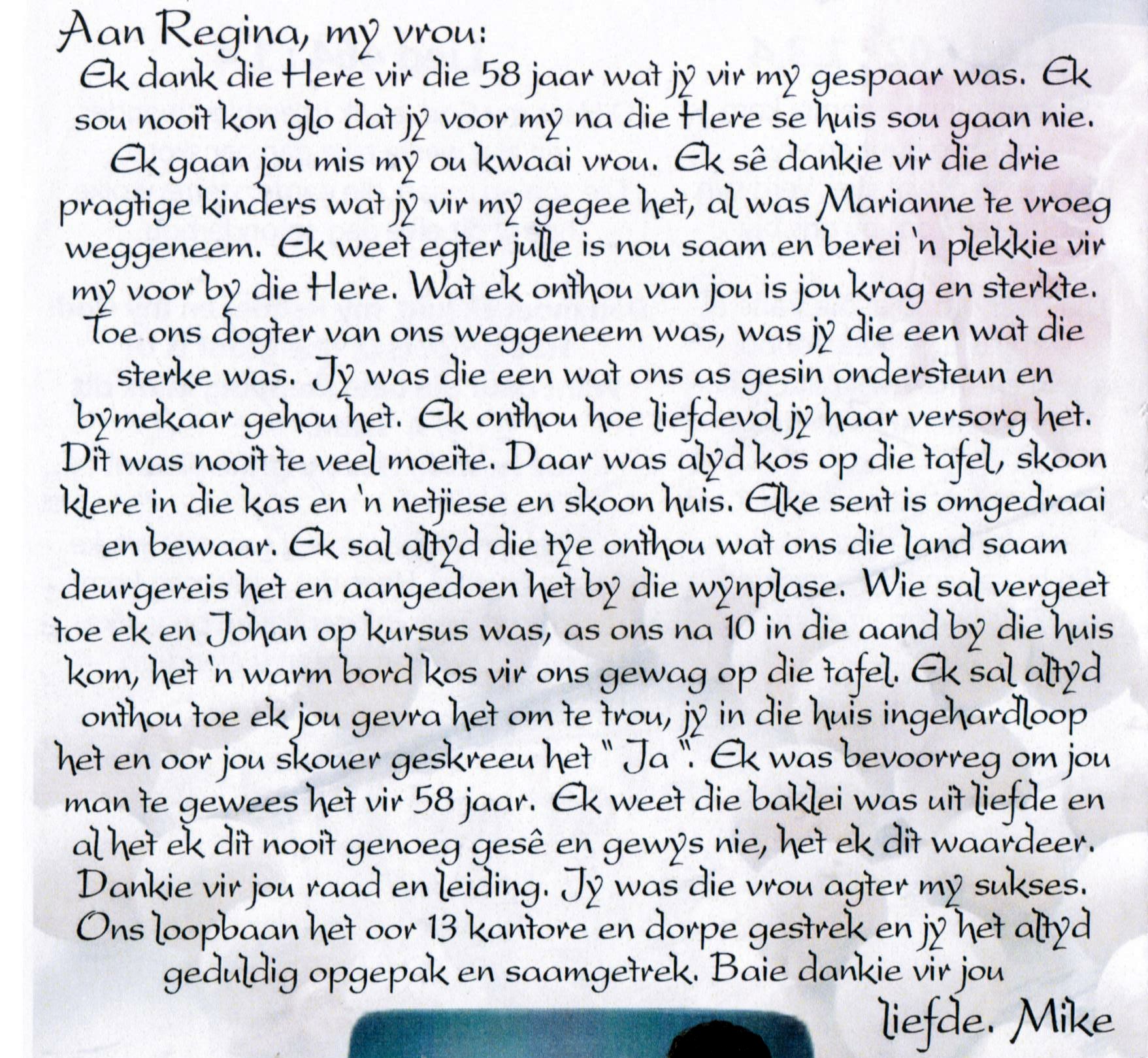 Volgens E-mail ontvang vanaf Lourens De Jager gedateer 20260115 die volgende addisionele info: Goeie dag Hendrik Sien aangeheg die begrafnisbrief van Regina Catharina Roets (Geb. CLAASSENS). Sy was die jongste kind van Jacobus William (Koos) CLAASSENS (2 Aug 1897- 16 Mei 1978) en Regina Catharina (Katriena) KLEYNHANS(4 Mrt 1901- 3 Apr 1983) In die CLAAS(S)EN geslagsregister (bl.697) is sy gelys as: A2b4c10d1e4f5g5h4i5 (nommer 16255) (Claassen, N. & Claassen,G.H. Die Claas(s)en afstammelinge in Suid-Afrika. 2001.) Sy is vernoem na haar ma- wat op haar beurt weer vernoem is na haar ouma Regina Catharina Celliers. Haar man Johannes Cornelius Michael (Mike) Roets was 'n landros gewees. Vriendelike Groete, Christiaan Lourens (Lourens) de Jager
