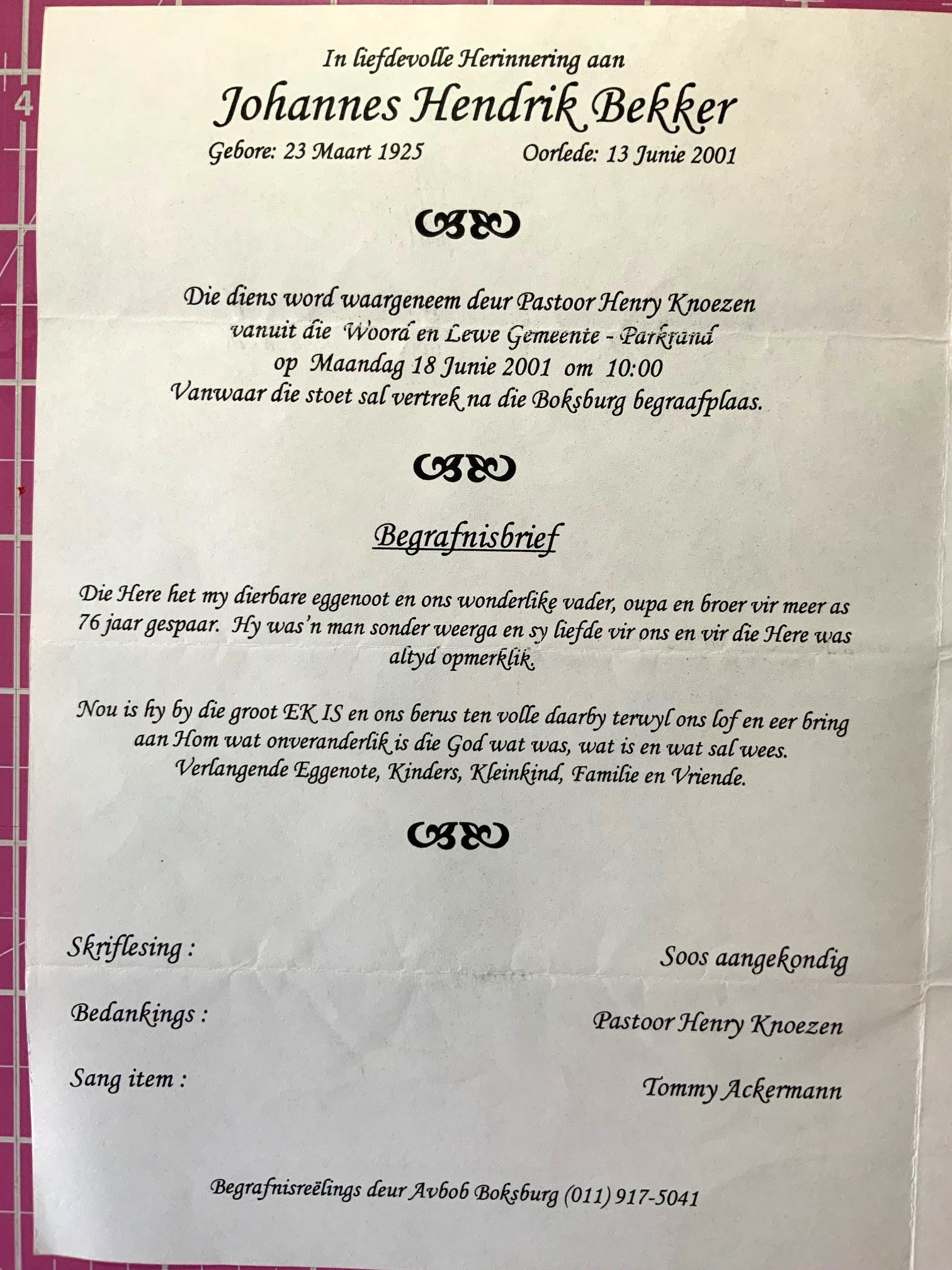 Funeral Programs / Begrafnisbriewe
