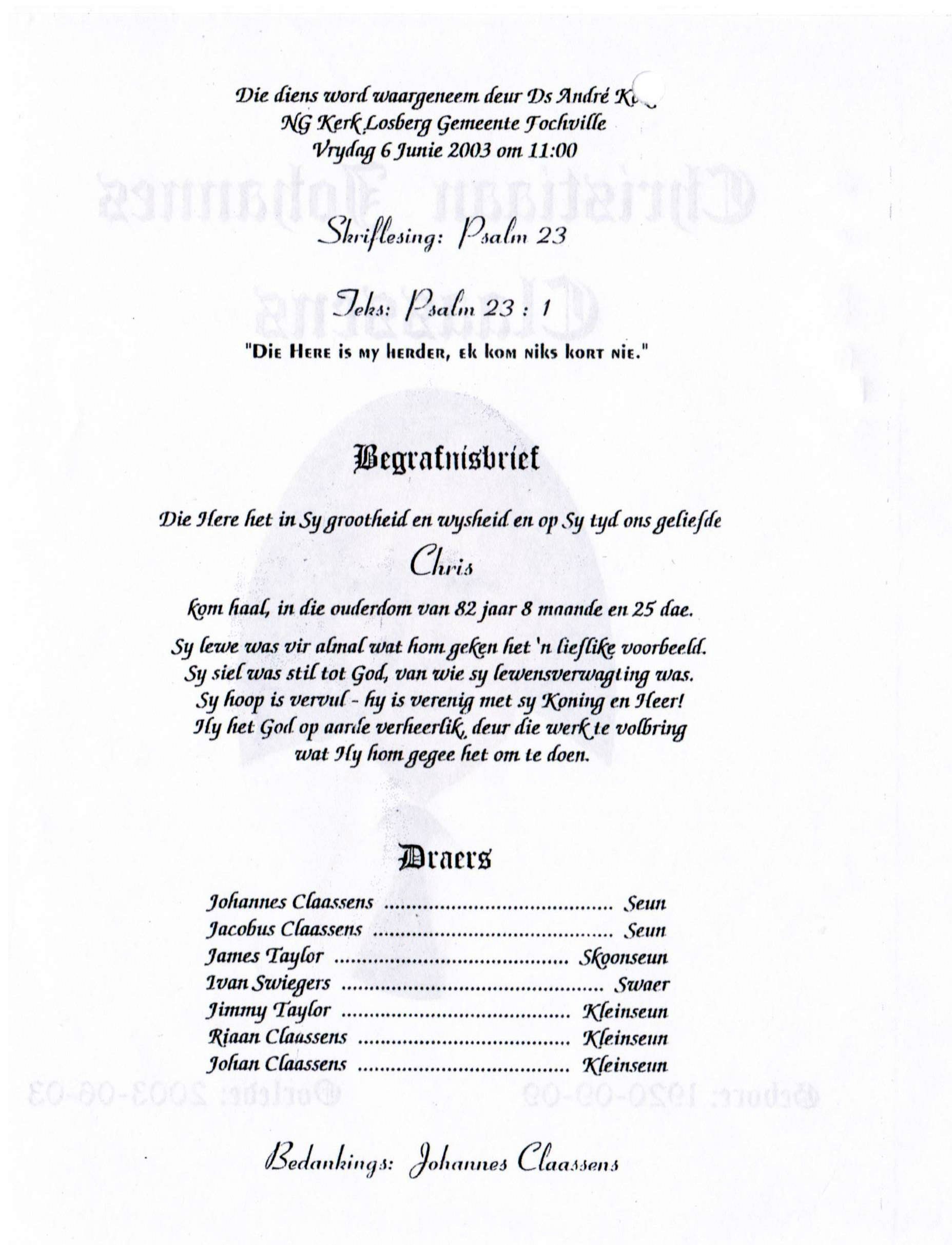 Volgens E-mail ontvang vanaf Lourens De Jager gedateer 20260118 die volgende addisionele info: Goeiedag Hendrik, Ek heg die begrafnisbrief van Christiaan Johannes(Chrisjan) CLAASSENS aan. Hy was die seun van Jacobus William (Koos) CLAASSENS (2 Aug 1897- 16 Mei 1978) en Regina Catharina (Katriena) KLEYNHANS(4 Mrt 1901- 3 Apr 1983). In die CLAAS(S)EN geslagsregister (bl.697) is hy gelys as: A2b4c10d1e4f5g5h4i1 (nommer 16251) (Claassen, N. & Claassen,G.H. Die Claas(s)en afstammelinge in Suid-Afrika. 2001). Hy is op 10 Mrt 1943 te Brits getroud met Alida Johanna(Alida) SWIEGERS. Vriendelike Groete, Christiaan Lourens (Lourens) de Jager
