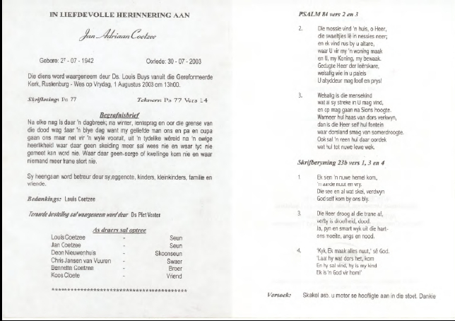 Funeral Programs / Begrafnisbriewe